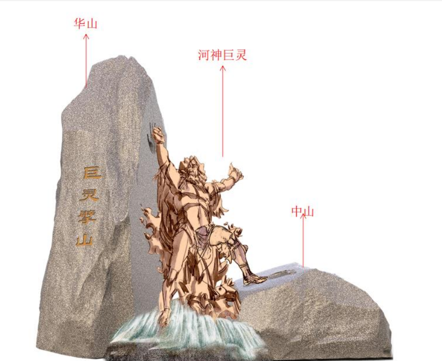 巨靈擘山,誕生中華,隱喻黃河母親,哺育華夏人族,開啟中華人類史。人類除了道法自然,還可以掌握規(guī)律,改造自然,從而為參贊化育,造福人類。也說(shuō)明中華民族,本來(lái)一體,不可分割。