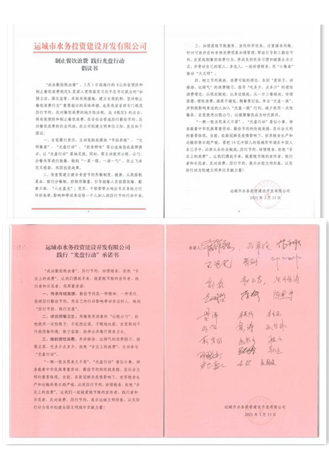 為響應(yīng)中央、省、市堅(jiān)決制止餐飲浪費(fèi)行為的號召,水投公司積極按文件要求,采取多種形式進(jìn)行宣傳落實(shí)。3月16日,公司以“制止餐飲浪費(fèi)、踐行光盤行動”為主題,組織開展了系列活動,在公司及項(xiàng)目公司餐廳張貼公益海報(bào),在公司大廳一樓大屏幕播放宣傳語。同時(shí),在公司微信群發(fā)送了制止餐飲浪費(fèi)、踐行光盤行動倡議書及承諾書,全體干部職工紛紛響應(yīng),簽署了《制止餐飲浪費(fèi)、踐行光盤行動承諾書》。
